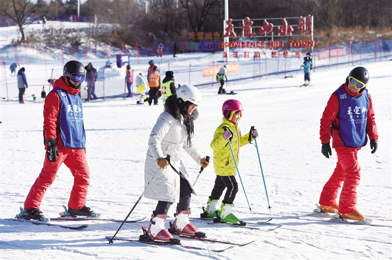 12月3日,在长春市天定山滑雪场,学生和家长在教练的指导下练习滑雪。
