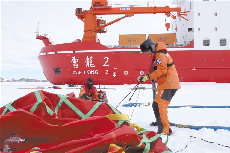 近日,正在执行中国第42次南极考察任务的“雪龙”号抵达南极中山站外围陆缘冰。“雪龙2”号已于北京时间11月25日率先抵达该区域。两船正协同开展中山站区域大规模卸货作业。本次作业将累计完成约2000吨各类物资卸运。按计划,整体卸货作业将持续约15天。据“雪龙2”号轮机长李文明介绍,“雪龙2”号是首次为考察站补给燃油。