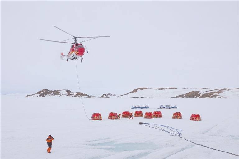 北京时间12月2日傍晚,“雪鹰102”直升机从“雪龙”号甲板飞至“雪龙2”号船侧冰面作业点,开启油囊吊挂作业。