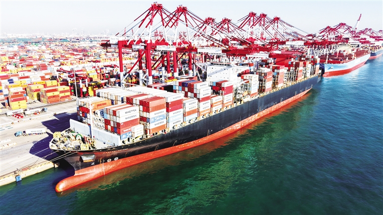 12月8日,货轮在山东港口青岛前湾港装卸外贸集装箱。海关总署12月8日发布数据:今年11月份,我国货物贸易进出口3.9万亿元,同比增速回升至4.1%,从2月起连续10个月保持同比增长。