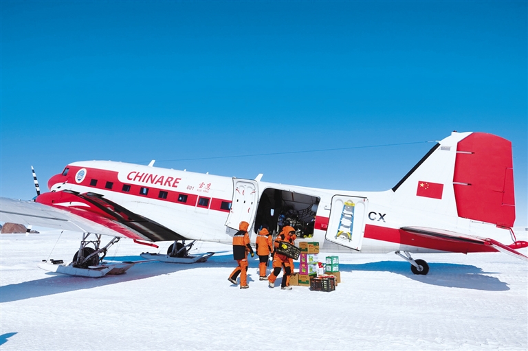 图为12月8日,“雪鹰601”飞抵格罗夫山区域,为内陆队员运输生活物资与科研设备。