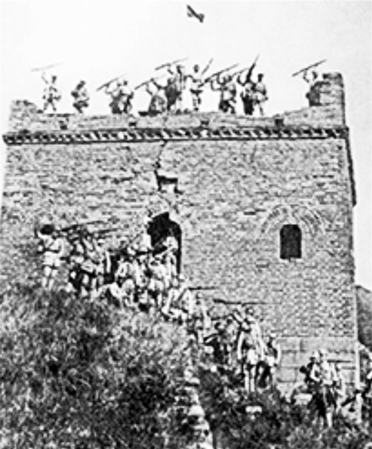1940年,百团大战第二阶段,一分区三团攻克涞源县东团堡,全歼日军士官教导大队170余人。图为八路军战士在古城堡上欢呼胜利。 (资料片)