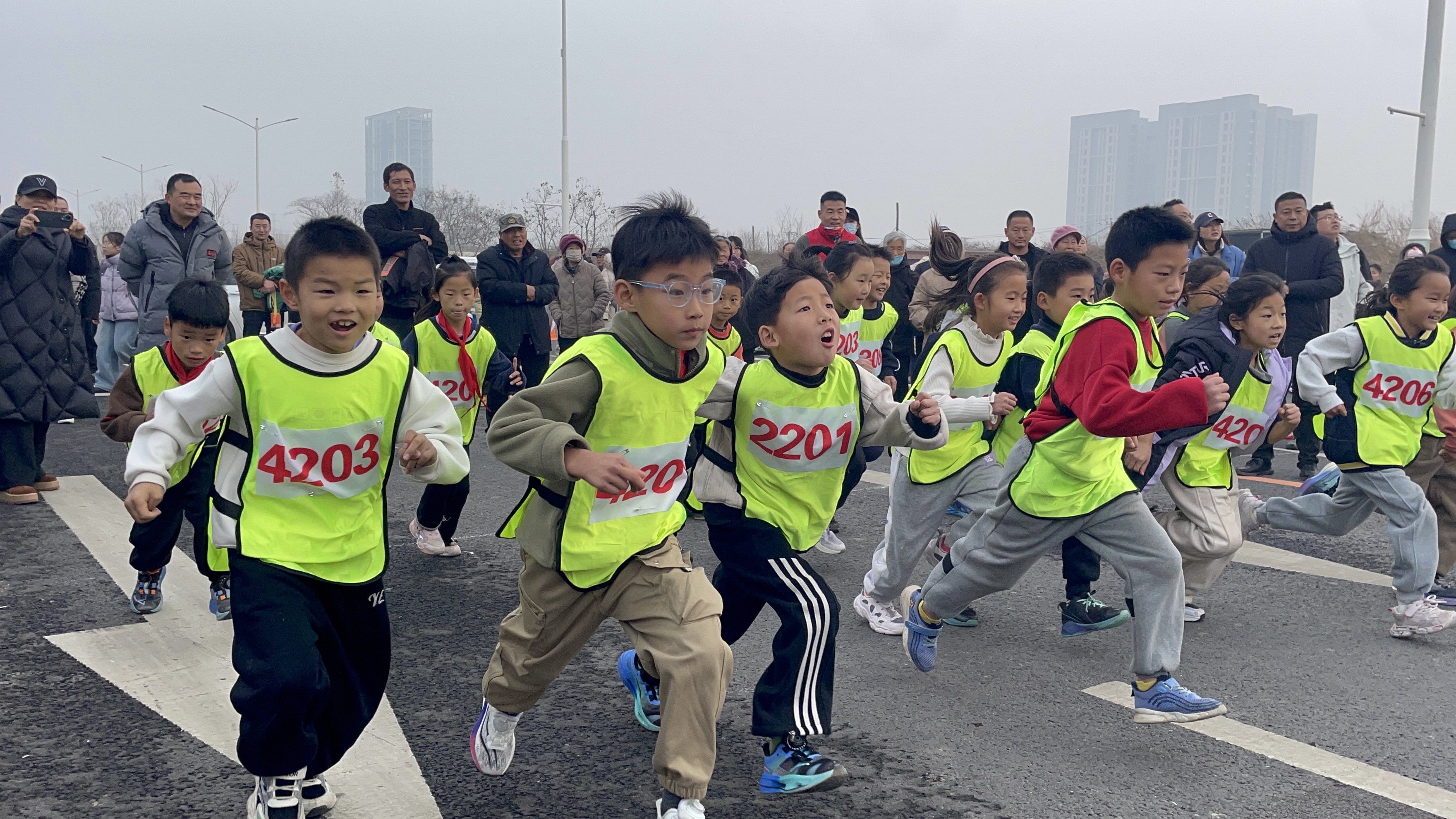 赛前,师生们在指导老师的带领下认真进行热身运动,现场洋溢着活泼而有序的氛围。随着起跑指令发出,运动员们如离弦之箭,你追我赶,奋力向前。跑道旁,各班级助威团高举标语、齐声呐喊,为选手们注入源源不断的动力。尽管天气寒冷,但每个人脸上都写满投入与喜悦。