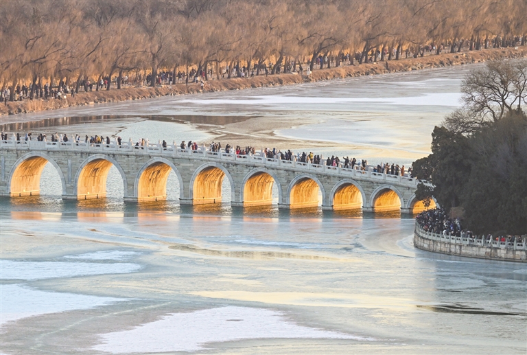 12月21日是冬至节气,北京颐和园十七孔桥的“金光穿洞”景观吸引了众多游客与摄影爱好者观赏拍摄。