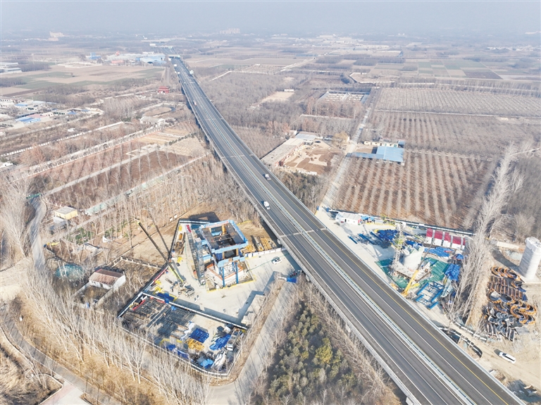 图为石雄铁路跨曲港高速转体连续梁主墩建设现场(12月23日摄,无人机照片)。