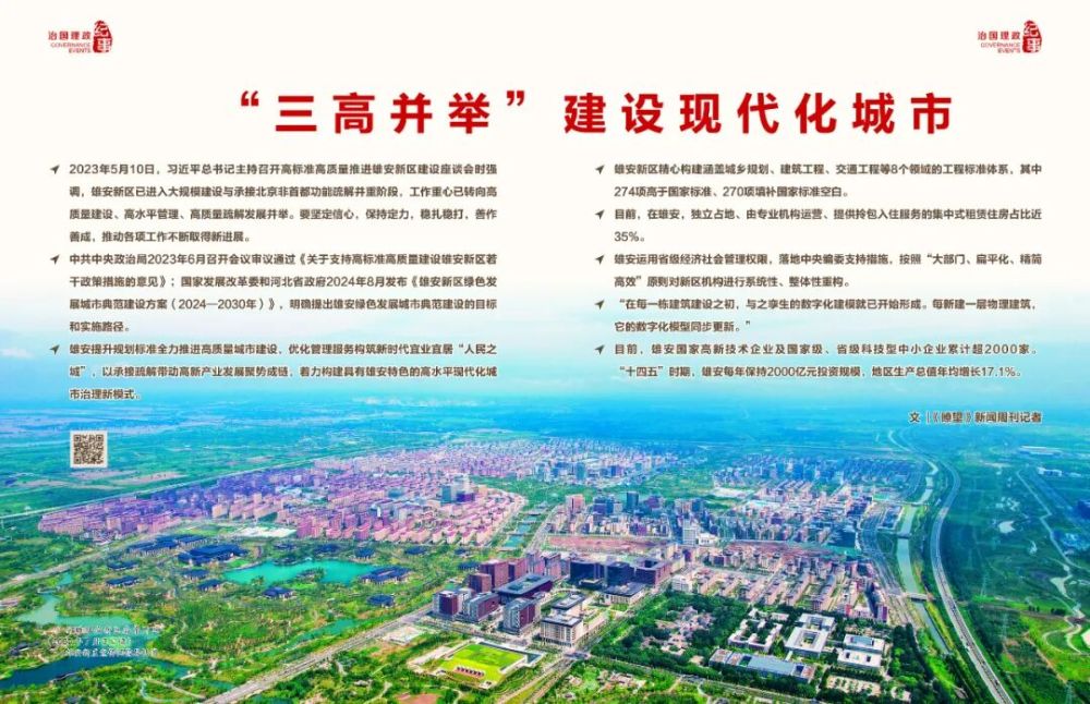 雄安提升规划标准全力推进高质量城市建设,优化管理服务构筑新时代宜业宜居“人民之城”,以承接疏解带动高新产业发展聚势成链,着力构建具有雄安特色的高水平现代化城市治理新模式。
