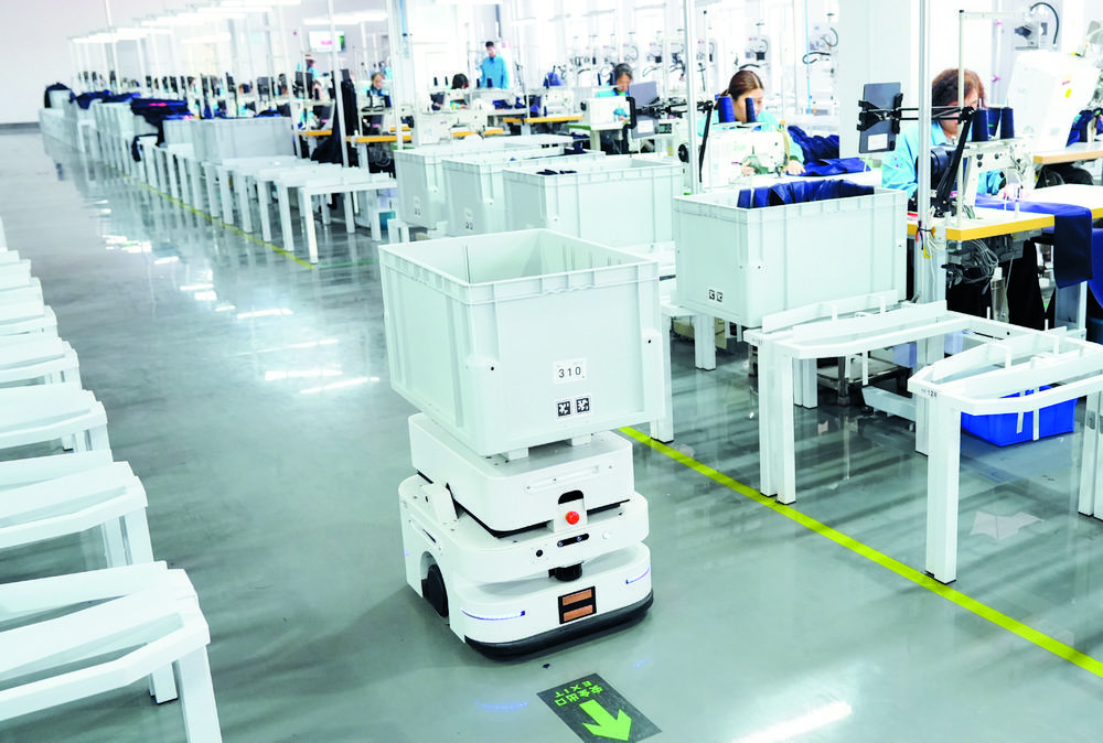 图为际华三五零二职业装有限公司无人衣料运送车。