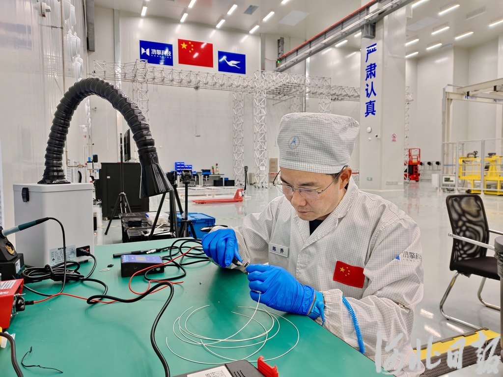 1月1日,蓝箭鸿擎(雄安)空间科技有限公司的厂房内,工程师正在为“雄安一号”卫星进行热实施电缆焊接。张佳旺摄