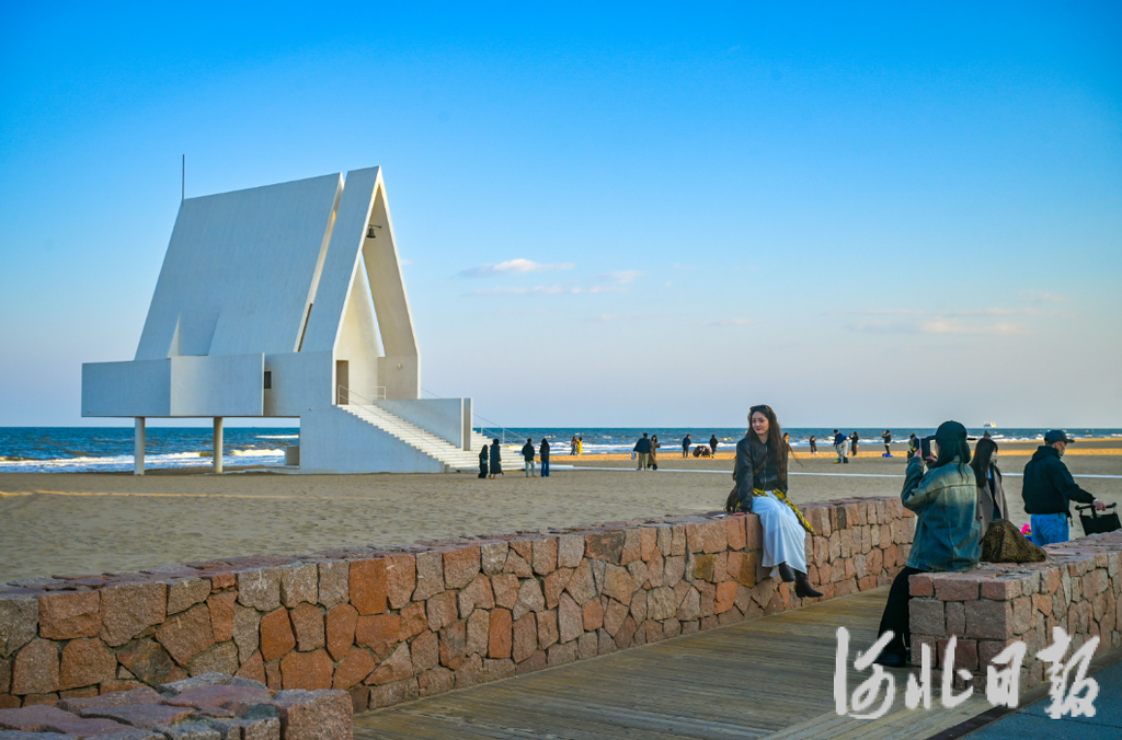 2025年4月15日,在秦皇岛市北戴河新区阿那亚社区,游客在与阿那亚礼堂合影。河北日报记者赵杰摄