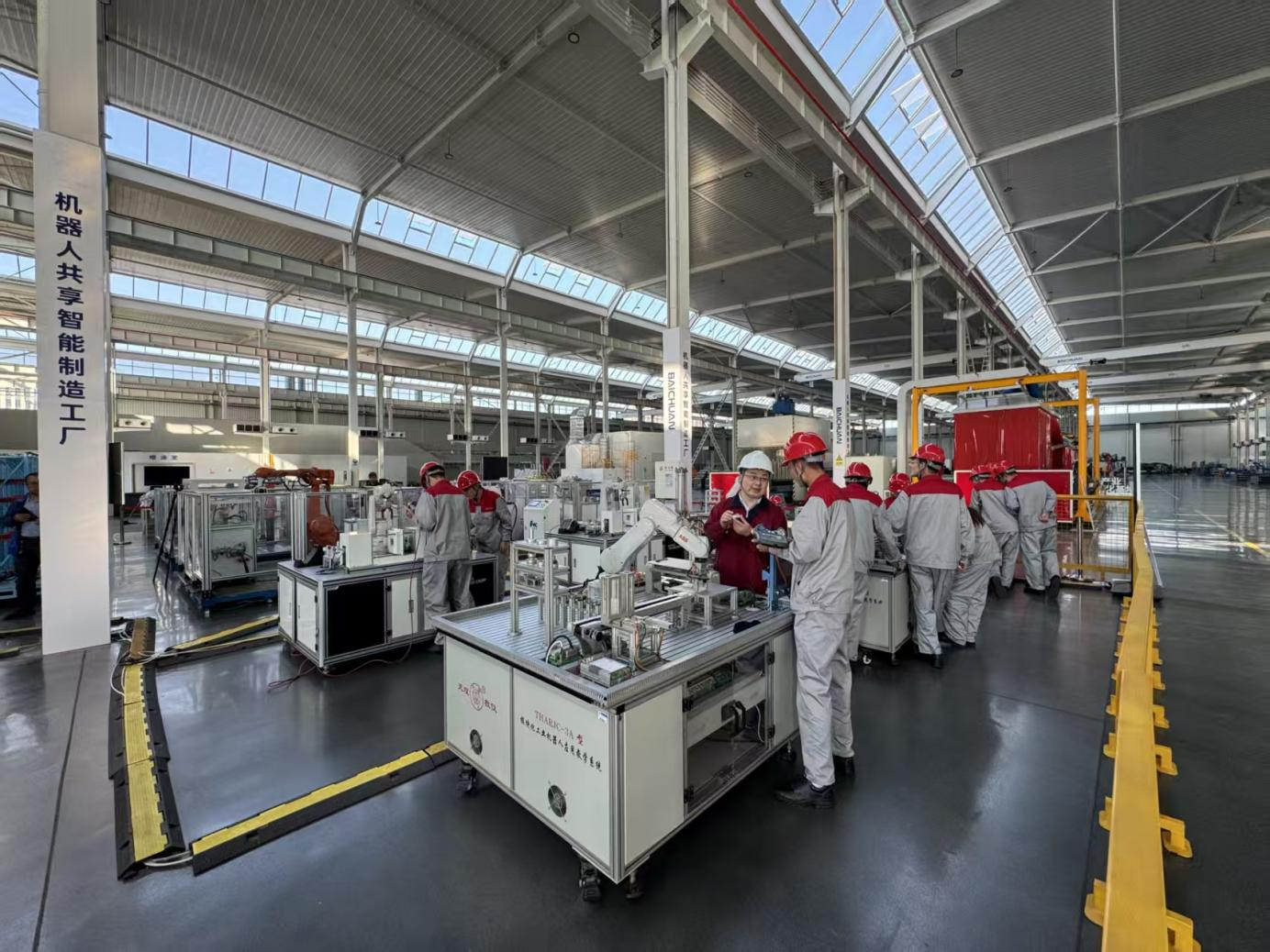 在唐山高新技术产业开发区产教联合体建设的机器人共享智能制造工厂中,唐山工业职业技术大学学生正在开展实践活动