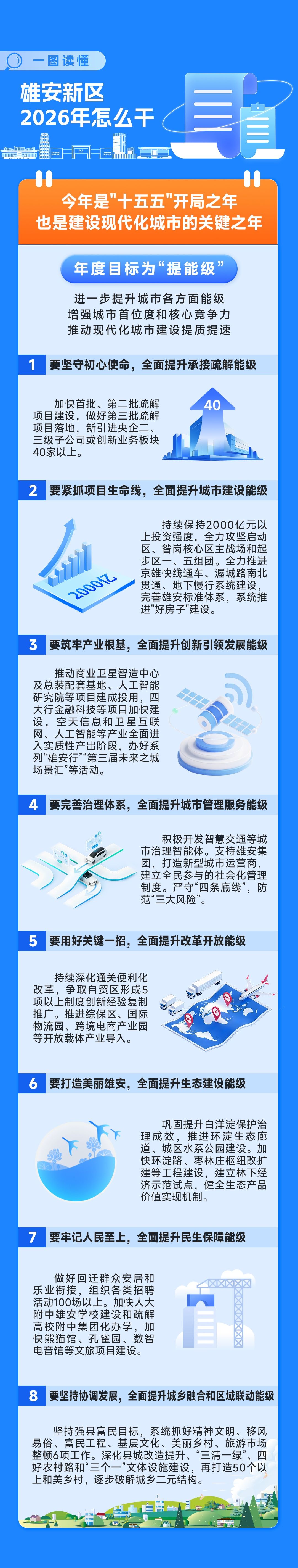 1月5日,雄安新区召开2026年工作会议。会议强调,“十五五”时期,是雄安推进“两个并重”“三个并举”和实现“五新目标”的重要阶段,是由新区转向城市、实现高质量跨越式发展、取得决定性进展、形成“新格局”的关键时期。新的一年,雄安新区怎么干,一图读懂。