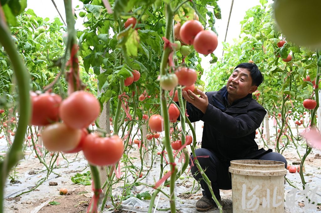 饶阳县留楚镇北空城村红响种植家庭农场,蔬菜种植户宋长江在棚室内采摘西红柿。河北日报资料片
