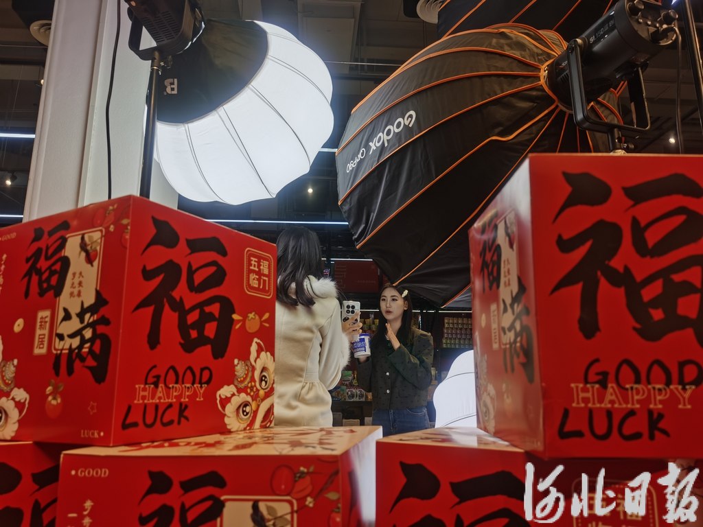 2025年12月24日,主播在邯郸市“一品一播”直播基地“彩立方”商品展示区内,向网友们介绍“邯郸好物”。河北日报记者陈正摄