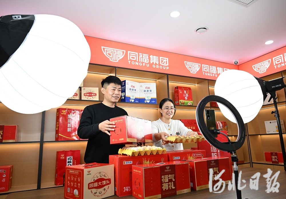 跟随李姗走进直播楼,她边走边介绍:一楼是特产超市,展销100多种正定特色商品;二、三楼共有8个直播间,每天播出12个小时以上;四楼是村史馆。“走,咱们到直播间看看。”李姗热情邀请。