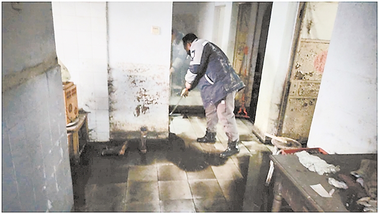 为尽快解决问题,大世界社区迅速组建应急处理小组,工作人员赶赴现场,并及时协调辖区派出所民警到场协助,保障现场秩序平稳有序。抵达现场后,工作人员看到一楼住户家中已被污水完全浸泡,尽力安抚的同时与居民代表进行沟通,详细排查管道堵塞的具体情况,为后续维修工作的推进筑牢基础。