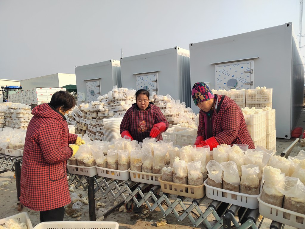 2025年12月30日,在新河县西流乡东董村汇珍食用菌有限公司,村民正在收割绣球菌。 河北日报记者 马彦铭摄
