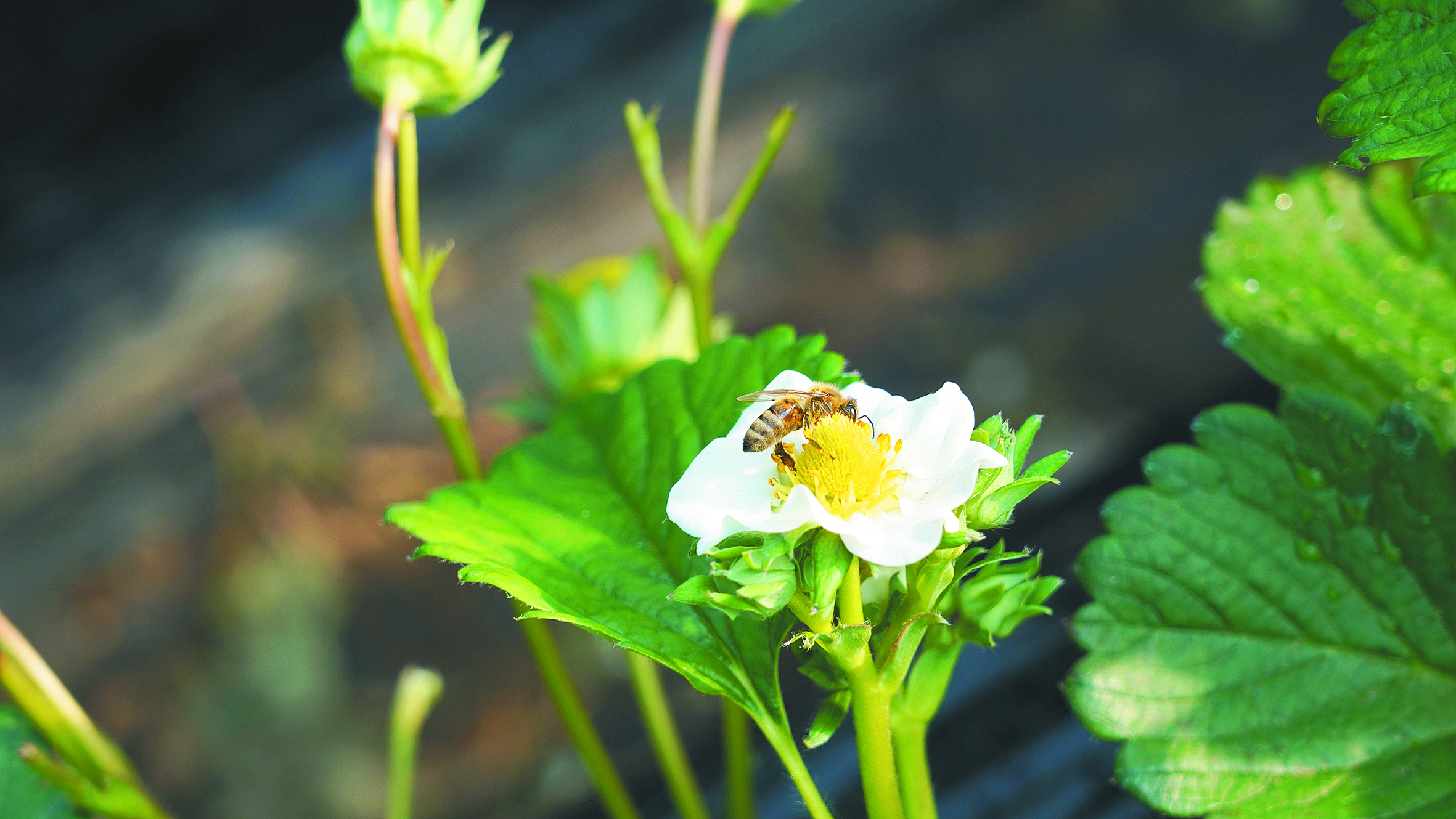 草莓花上忙碌的蜜蜂成了“天然质检员”。