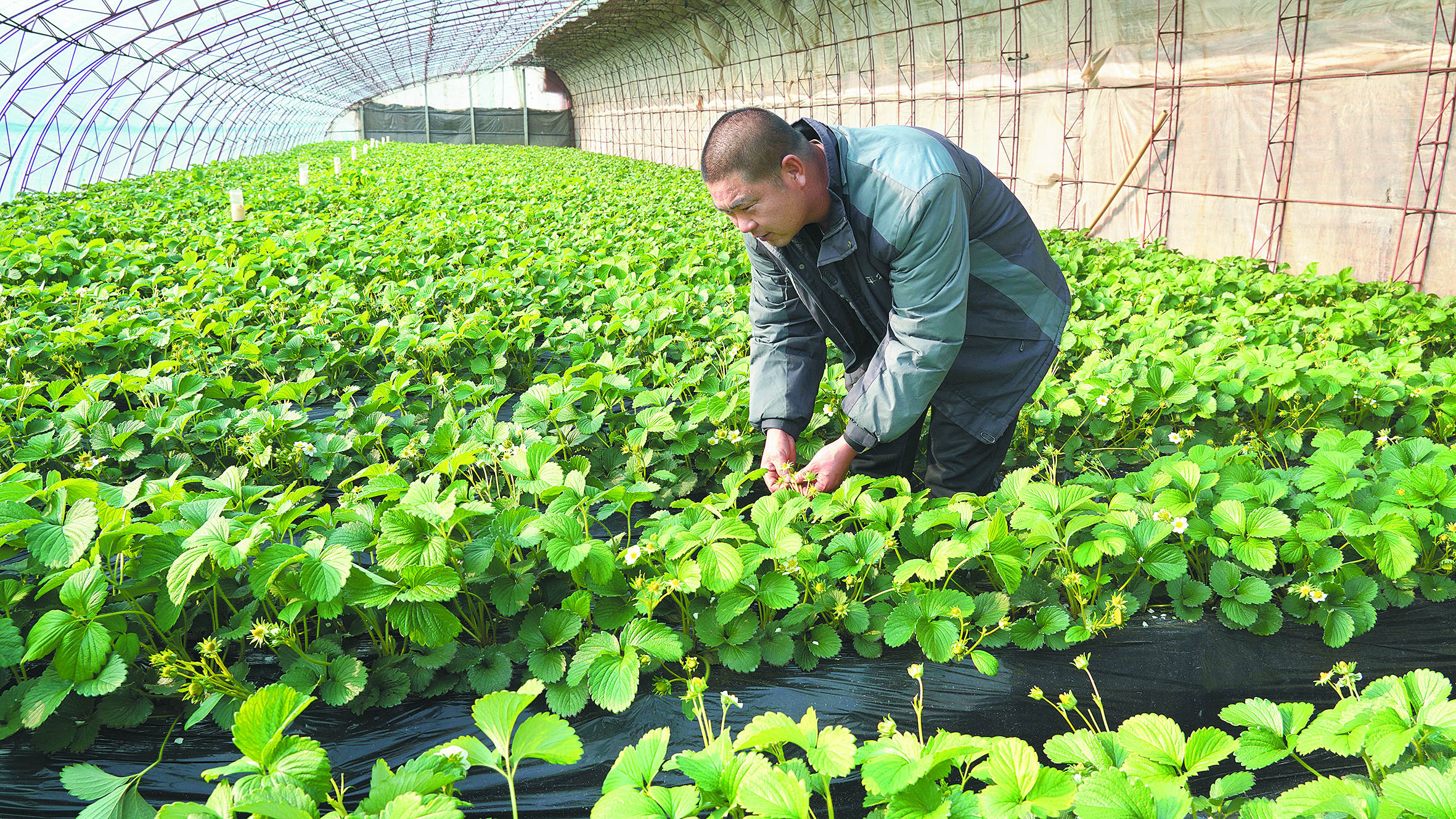 顾桂民在大棚里为草莓疏果。