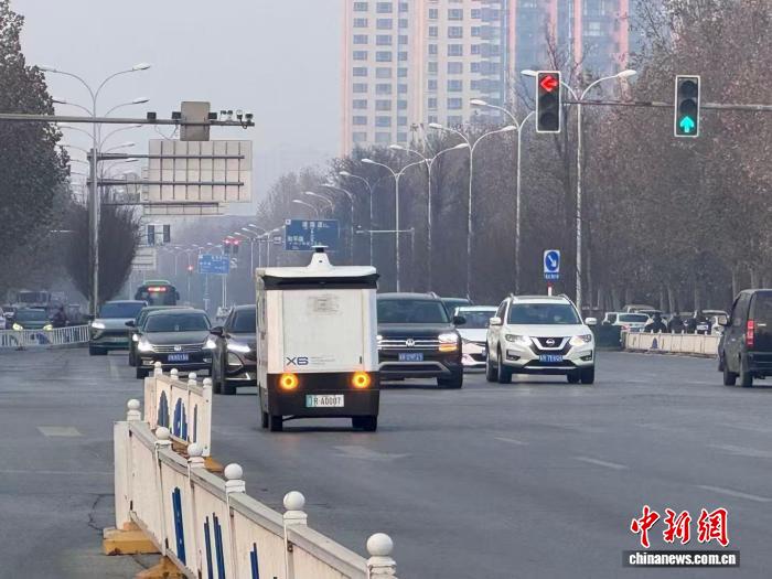 2025年12月17日,廊坊市街道上行驶的无人配送车。 赵丹媚 摄