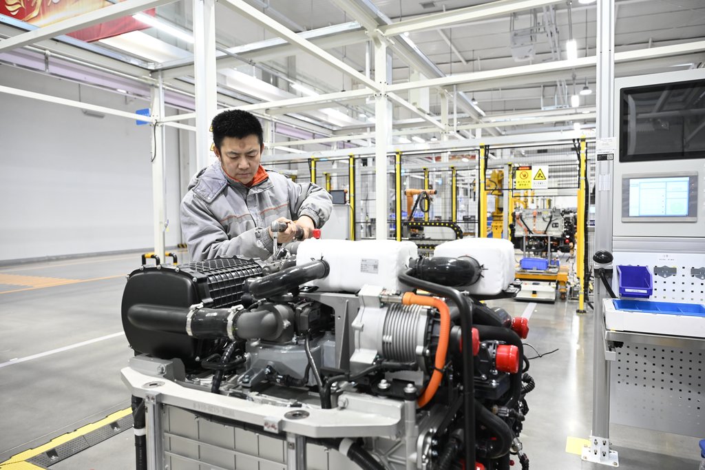 1月7日,在北京亿华通科技股份有限公司张家口生产基地,工人正在组装氢燃料电池发动机。河北日报记者郭晓通摄