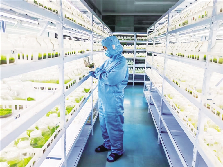 在植物细胞创新工厂,工作人员查看石斛胚芽培育情况。 杨毅松 摄