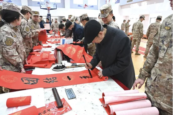 活动现场墨香氤氲,暖意融融。书画家们铺纸研墨、凝神挥毫,笔锋起落间,一幅幅主题鲜明的佳作跃然纸上。春联等书法作品笔力扎实,字里行间饱含对官兵的赞颂与期许;山水画作勾勒出祖国河山风貌,既象征中华民族的精神脊梁,也融入军人戍边卫国的信念;花鸟作品与寓意吉祥的“福”字,为军营增添节日氛围,每一笔划都承载着对子弟兵的深情厚谊。