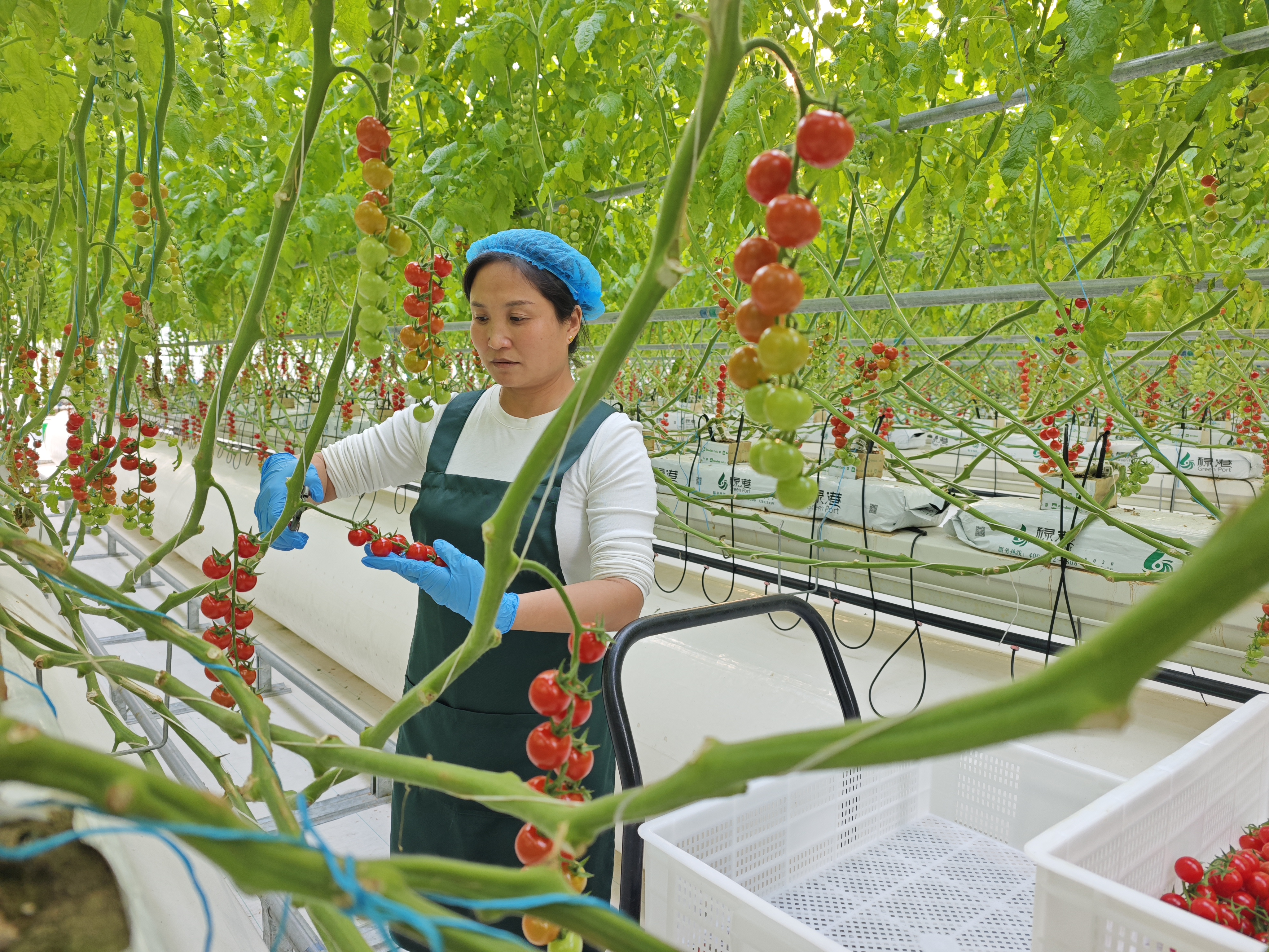 徐娜手持专用剪刀,穿梭其中,早就掌握了采摘和选品的技巧。看着成熟的小番茄,徐娜说:“每串在10个果以上,对称均匀,单果在10克以上,就是一级品。每个果的价格比一个鸡蛋都贵!”徐娜每天骑电动车5分钟上班,一天工作8小时。在“家门口”上班,不仅没有风吹日晒,工作强度也不大,还有一份可观的收入,简直太幸福了。