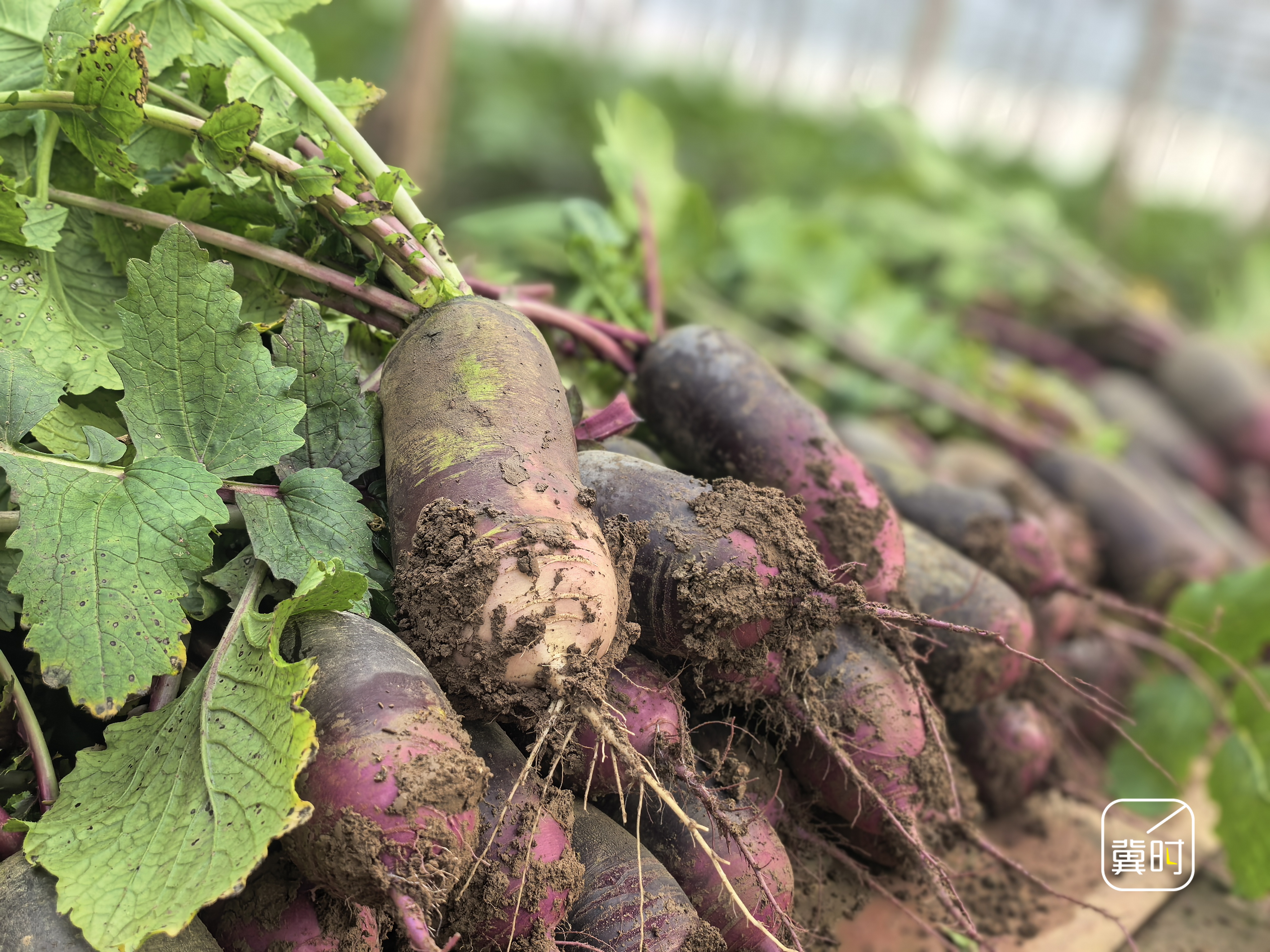 沧州盐山县边务镇星马村的设施大棚内,绿油油的萝卜叶子高过了小腿肚儿,一个个紫红色的萝卜匀称笔直,探出地面。当地引进的果蔬新品种——“冰淇淋”萝卜迎来采收季。