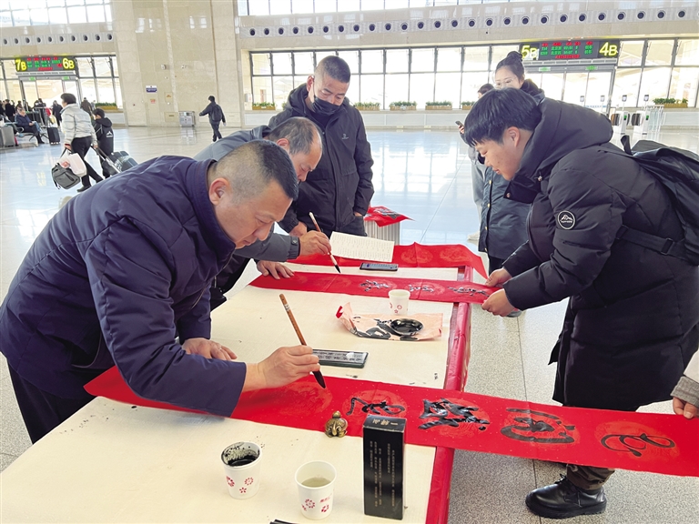 书法爱好者挥毫写春联,为即将回家过年的旅客送上祝福。