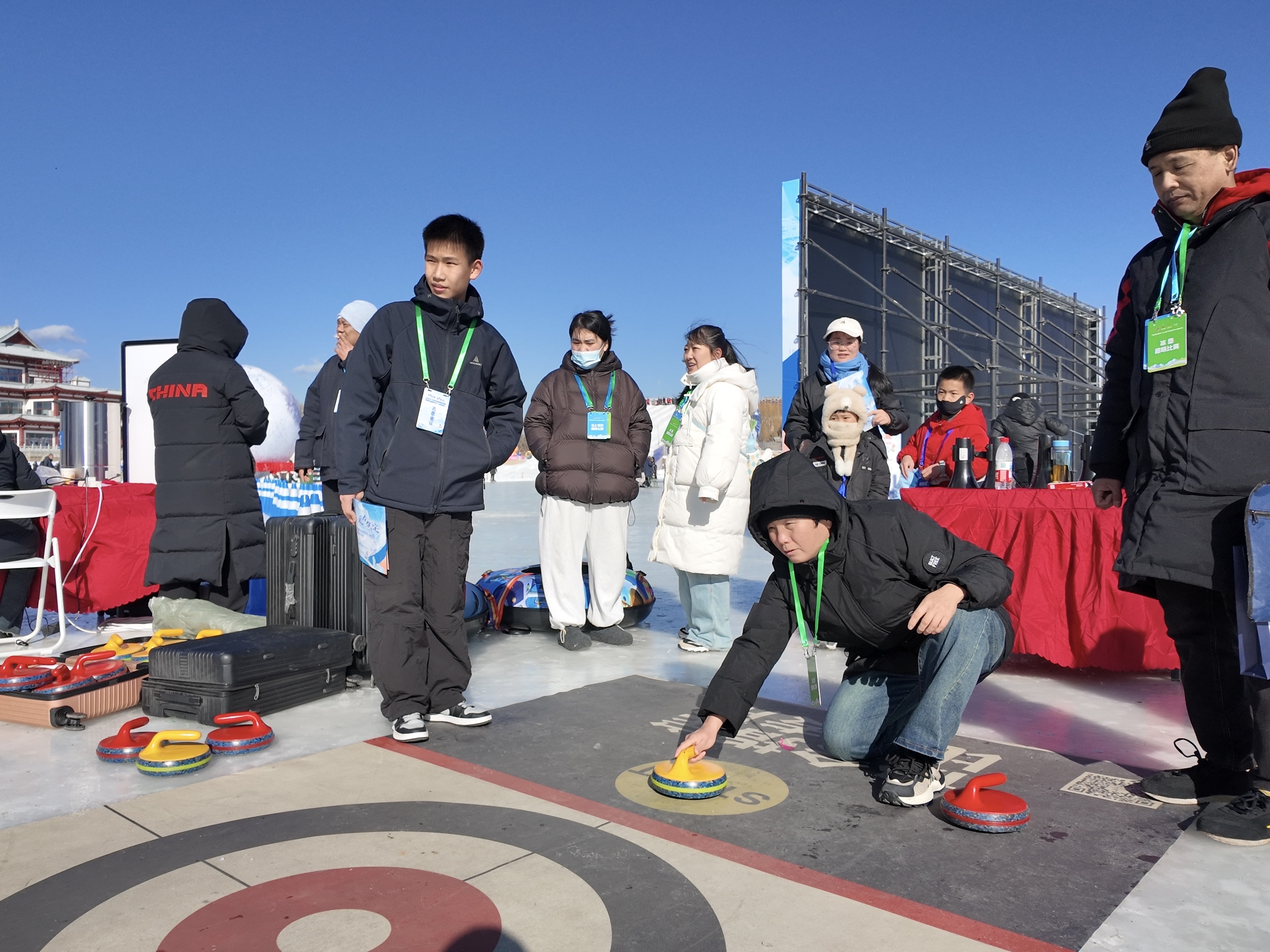 活动兼顾竞技性与趣味性。“冬游涞源 冰雪为伴”冰上嘉年华聚焦团体竞技,各县(市、区)教体局代表队展开冰上拔河、冰上自行车竞速、冰上推轮胎等项目比拼,选手们在冰面之上协同配合、激情竞技。保定市冰上趣味运动会则以家庭为核心参与单元,设置八大趣味关卡与终极挑战,极冰狂飙、冰壶冲冲冲、勇撞保龄球、套圈儿、冰上我最强、快乐家庭跑起来、冰上铁环接力赛、碰碰悠波球等关卡项目趣味感十足。亲子携手闯关、欢声笑语回荡冰场,成为本次活动最动人的画面,也让冰雪运动的快乐扎根于每个家庭。对应不同积分,家庭累计得分优异者还可参与雪地抓大鹅的趣味终极冲冠环节,让参与者在欢笑中解锁冰雪乐趣。
