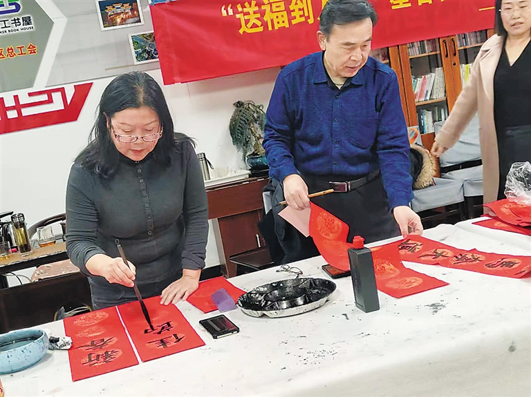 活动现场,书法名家与志愿者们凝神挥毫、倾情创作。一张张红纸之上,春联笔力雄健、满含新春期许,“福”字圆润饱满、寓意吉祥如意,跃然成形,不仅传递出浓浓年味,更搭建起工会与职工之间的文化互动桥梁,让职工群众在亲身体验中感受中华优秀传统文化的独特魅力。