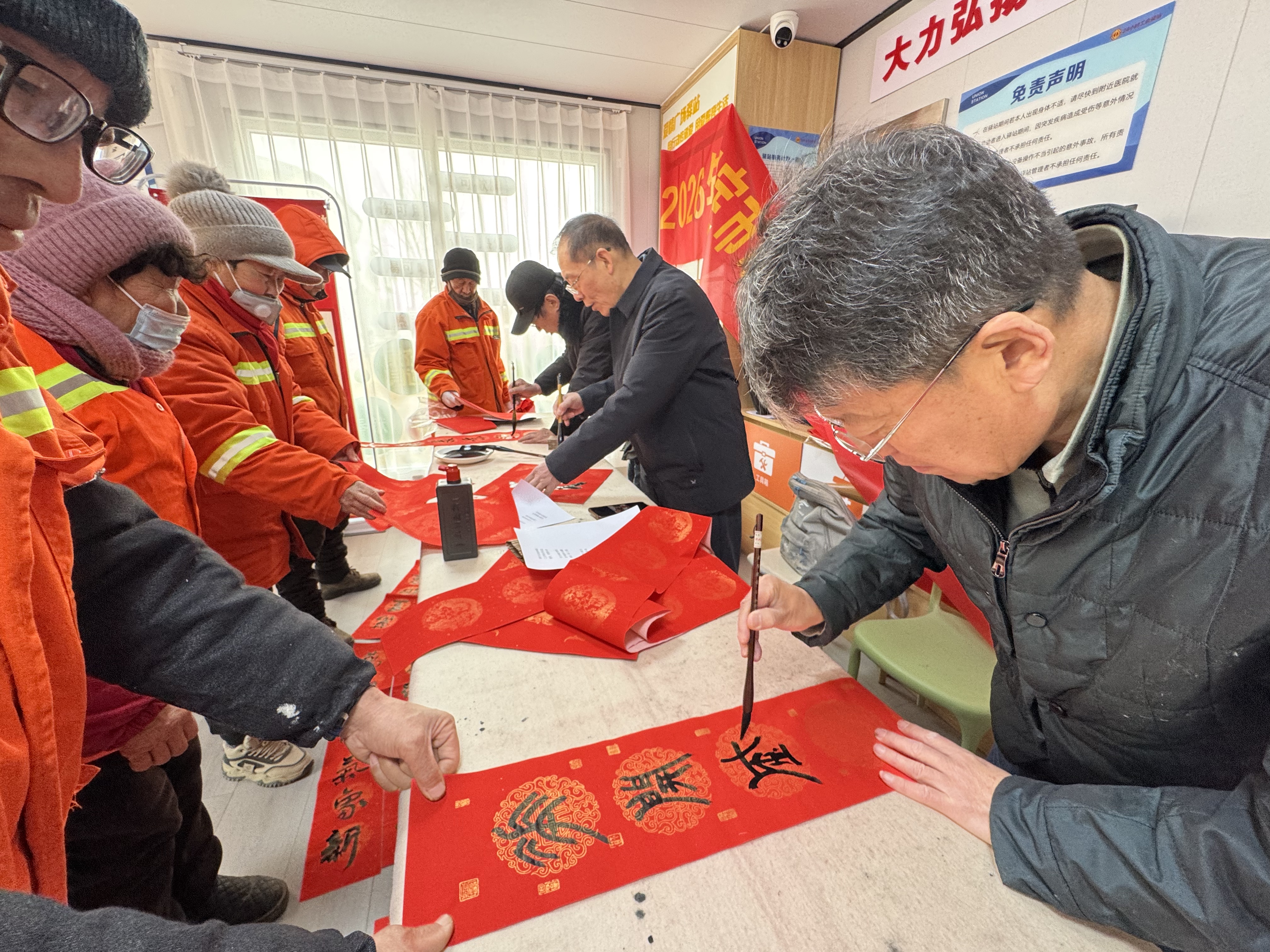 活动现场墨香四溢,暖意融融。大红宣纸整齐铺展,笔墨砚台依次排开,受邀书法家与工会书法爱好者们凝神挥毫、笔走龙蛇,楷书端庄大气、行书流畅洒脱,一个个饱满圆润、寓意吉祥的“福”字跃然纸上,一副副饱含期盼、寄托祝愿的春联新鲜出炉,字里行间既有对新春的憧憬,也有对一线劳动者的敬意。