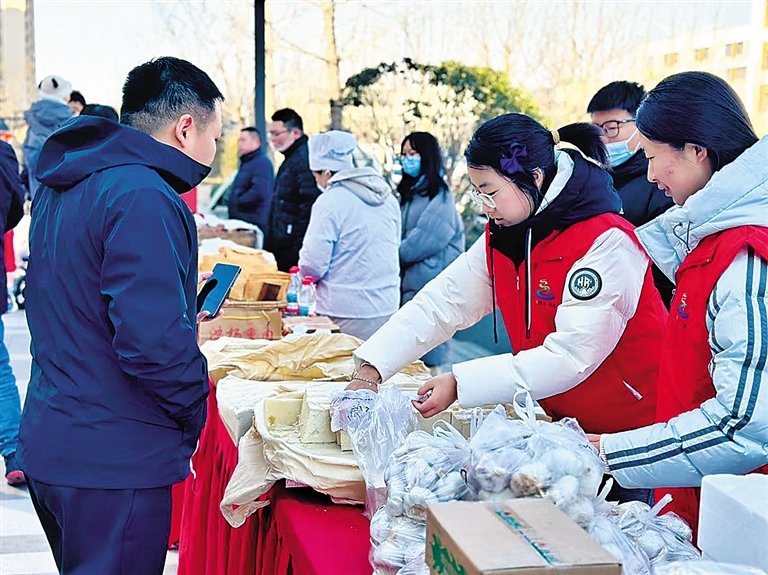活动现场,各类优质农产品陈列有序,试吃区更是香气扑鼻,吸引居民驻足品尝、选购。志愿者身穿红马甲,穿梭在人群中提供咨询、引导、打包等贴心服务,浓浓的烟火气与邻里温情交织,洋溢着喜迎新春的欢乐氛围。