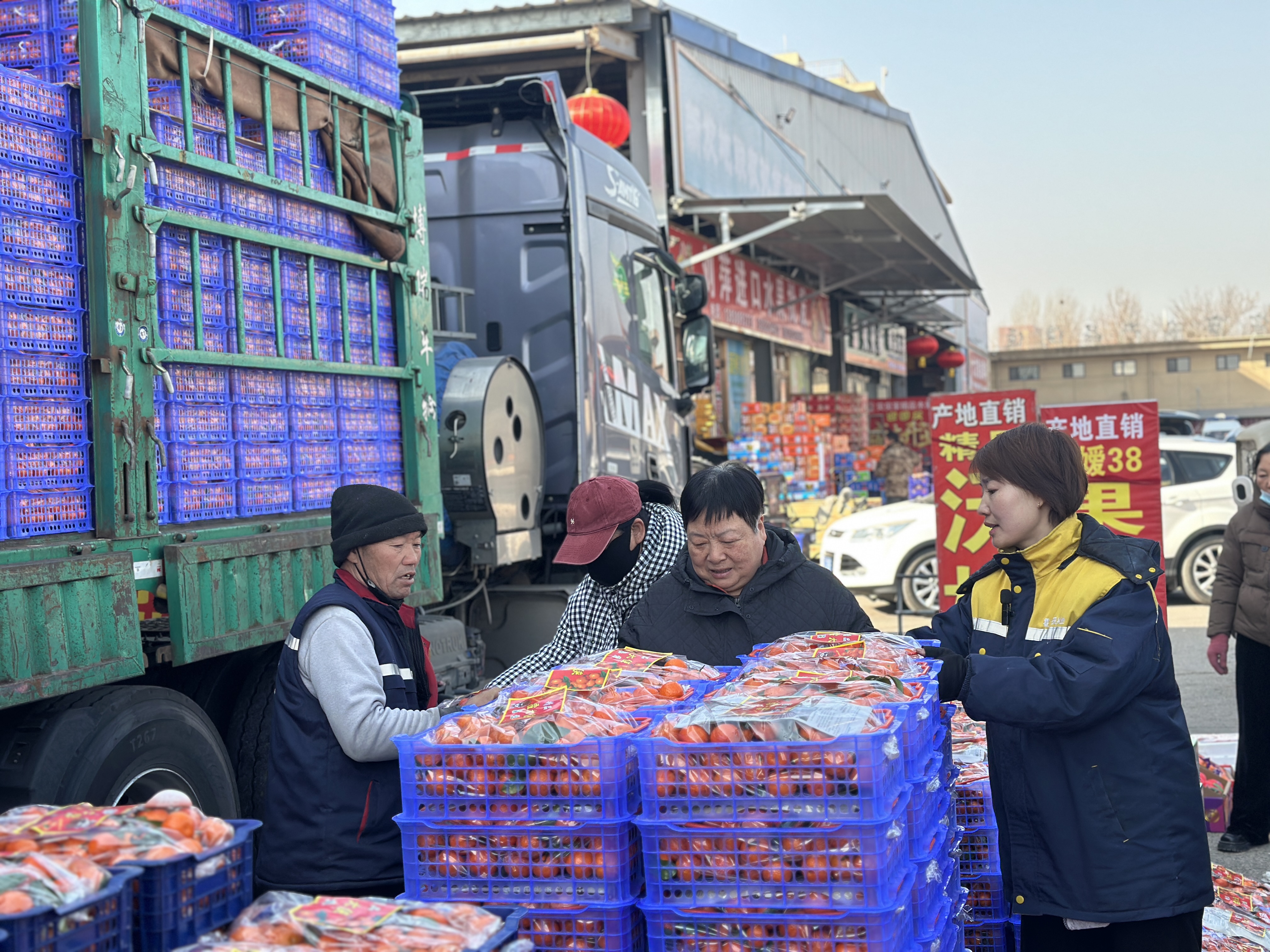水果交易区,霍伟娟正操着保定口音给广西来的货车司机指路。电子秤的报重声、胶带缠箱的刺啦声、三轮车的倒车提示音此起彼伏。