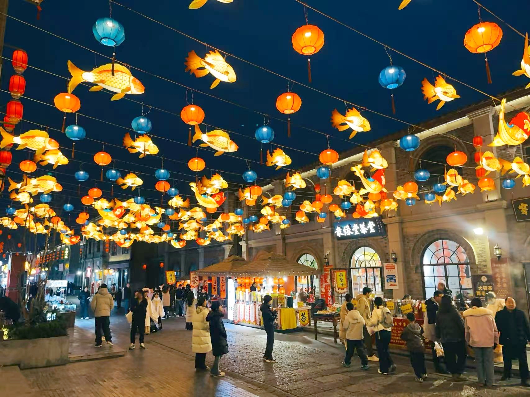 而当暮色将近,灯火沿着青砖黛瓦的轮廓一层层亮起来,整条街便成了一幅流淌的光影长卷。从瞻岳门的“福韵2026”灯组,到中段的“萌猫招财”——那只半浮雕萌猫眼睛会眨、前爪会摆,引得游客抓拍“猫送财运”的瞬间。东段砖楼墙面上,“锦鲤纳福”灯组雅致灵动,百米鱼灯通道铺出“年年有余”的光河。光影里,穿汉服的姑娘们提着裙摆缓缓走过,转角处街舞少年的动感音乐与不远处河北梆子的锣鼓点交织在一起。古典与时尚在此相遇,各不相扰,却又相映成趣。